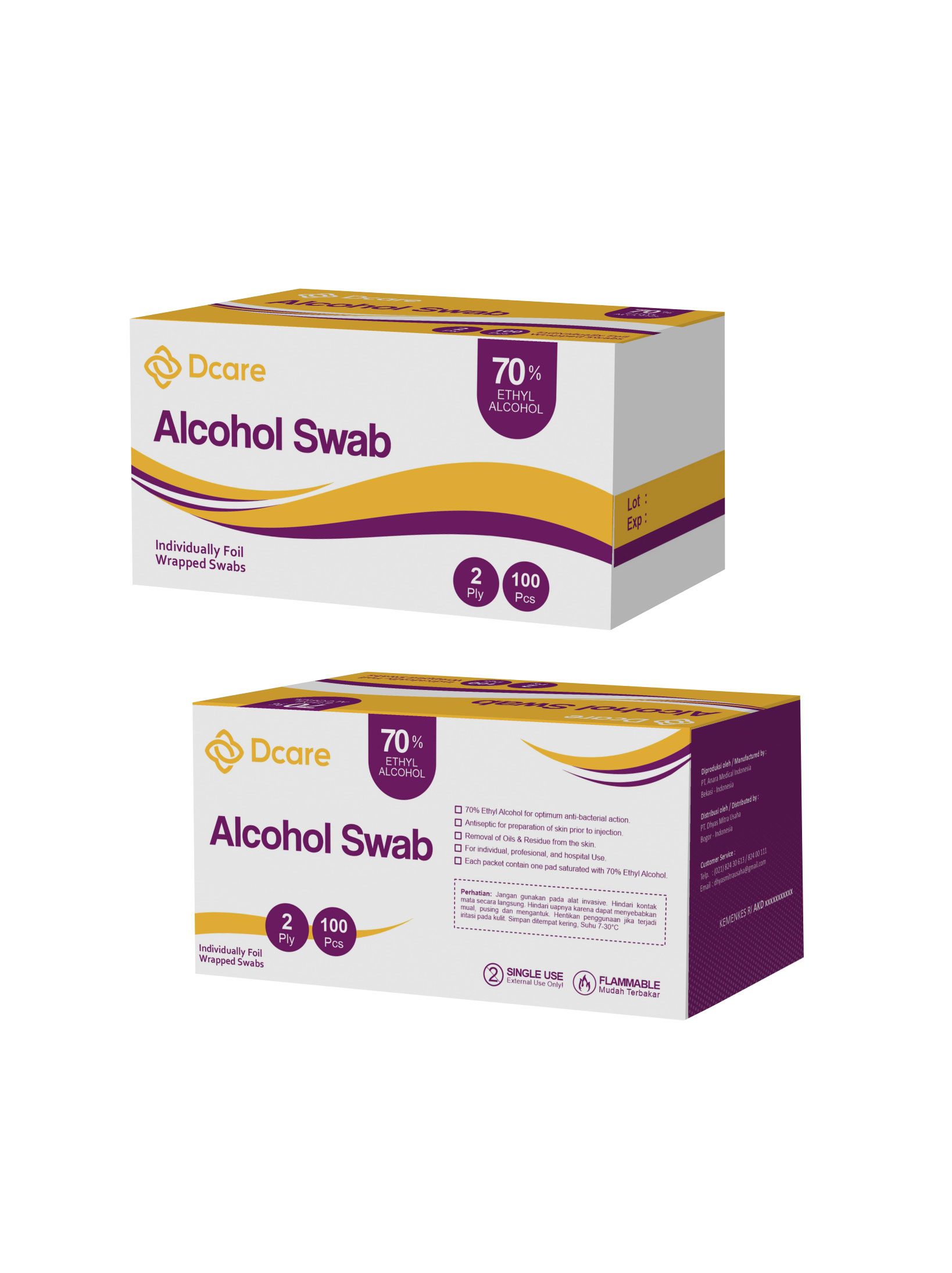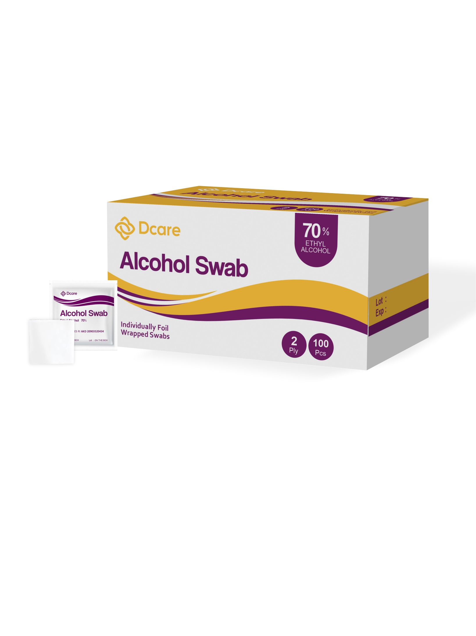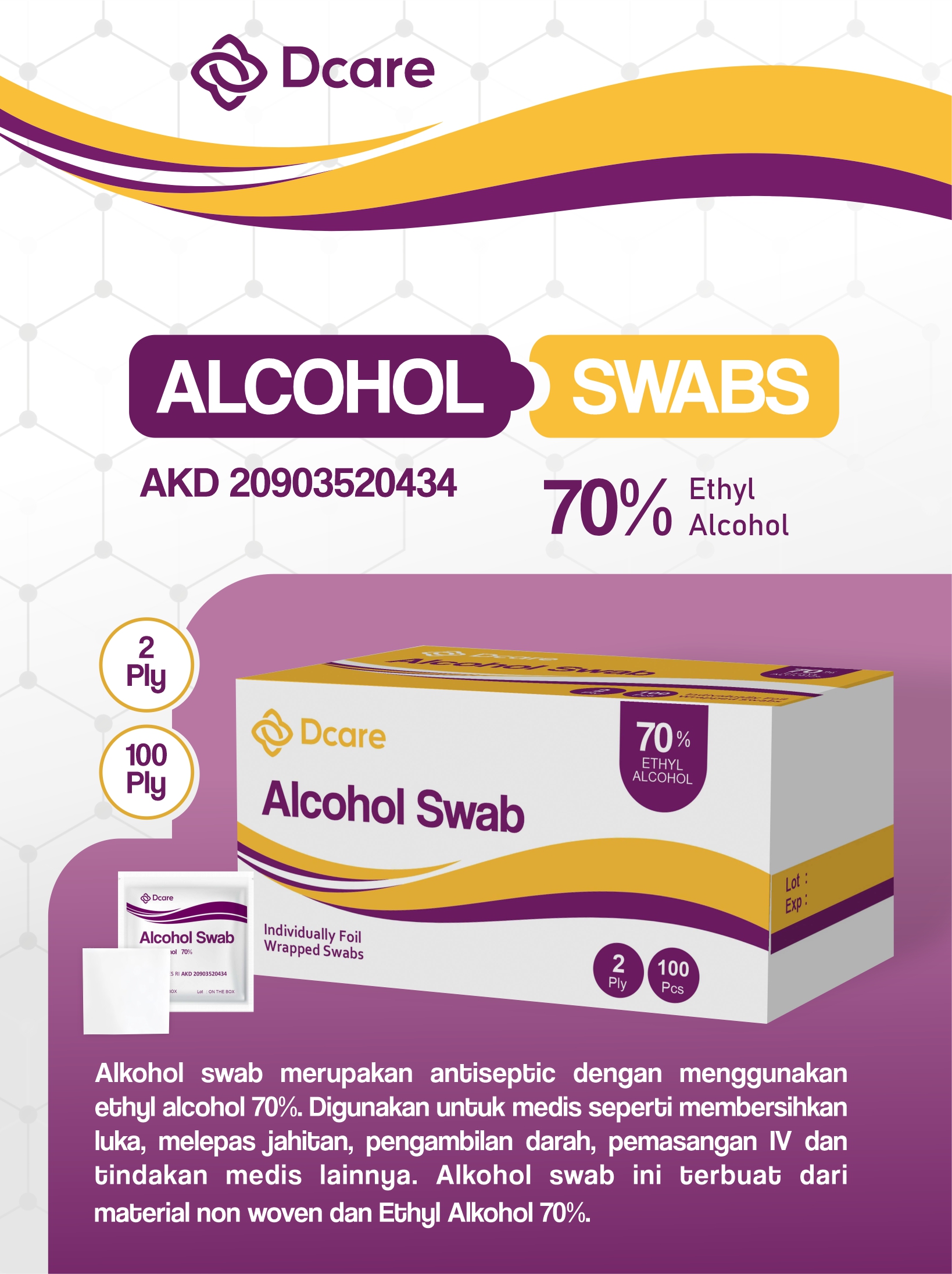 Alkohol swab merupakan antiseptic dengan menggunakan ethyl alcohol 70%. Digunakan untuk medis seperti membersihkan luka, melepas jahitan, pengambilan darah, pemasangan IV dan Tindakan medis lainnya. Alkohol swab ini terbuat dari material non woven dan Ethyl Alkohol 70%.