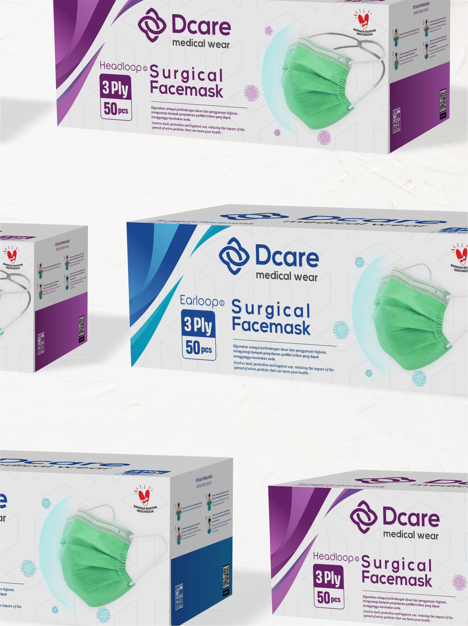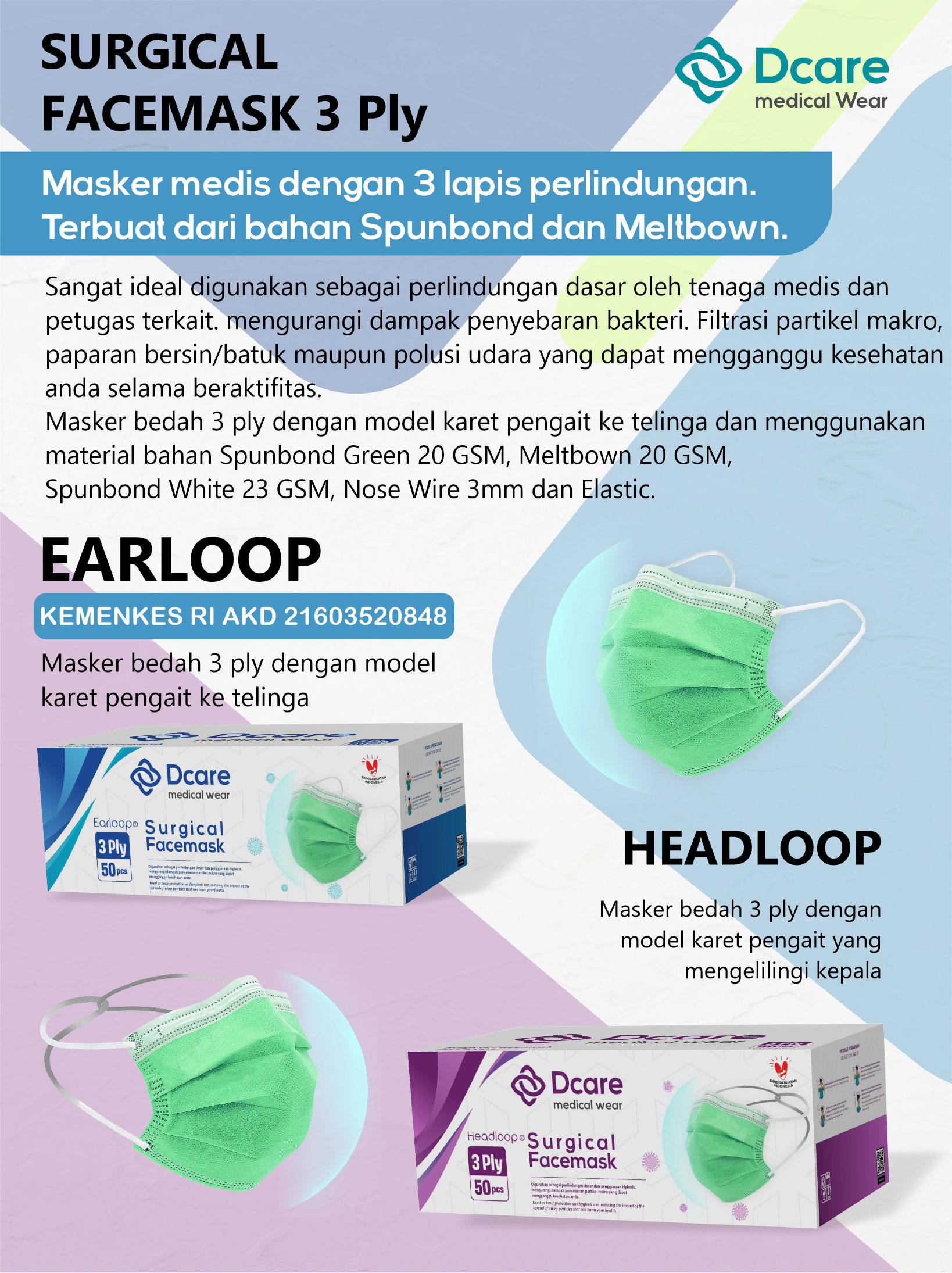 Masker bedah 3 ply earloop dengan model karet pengait yang mengelilingi kepala dan menggunakan material bahan Spunbond Green 20 GSM, Meltbown 20 GSM, Spunbond White 23 GSM, Nose Wire 3mm dan Elastic.