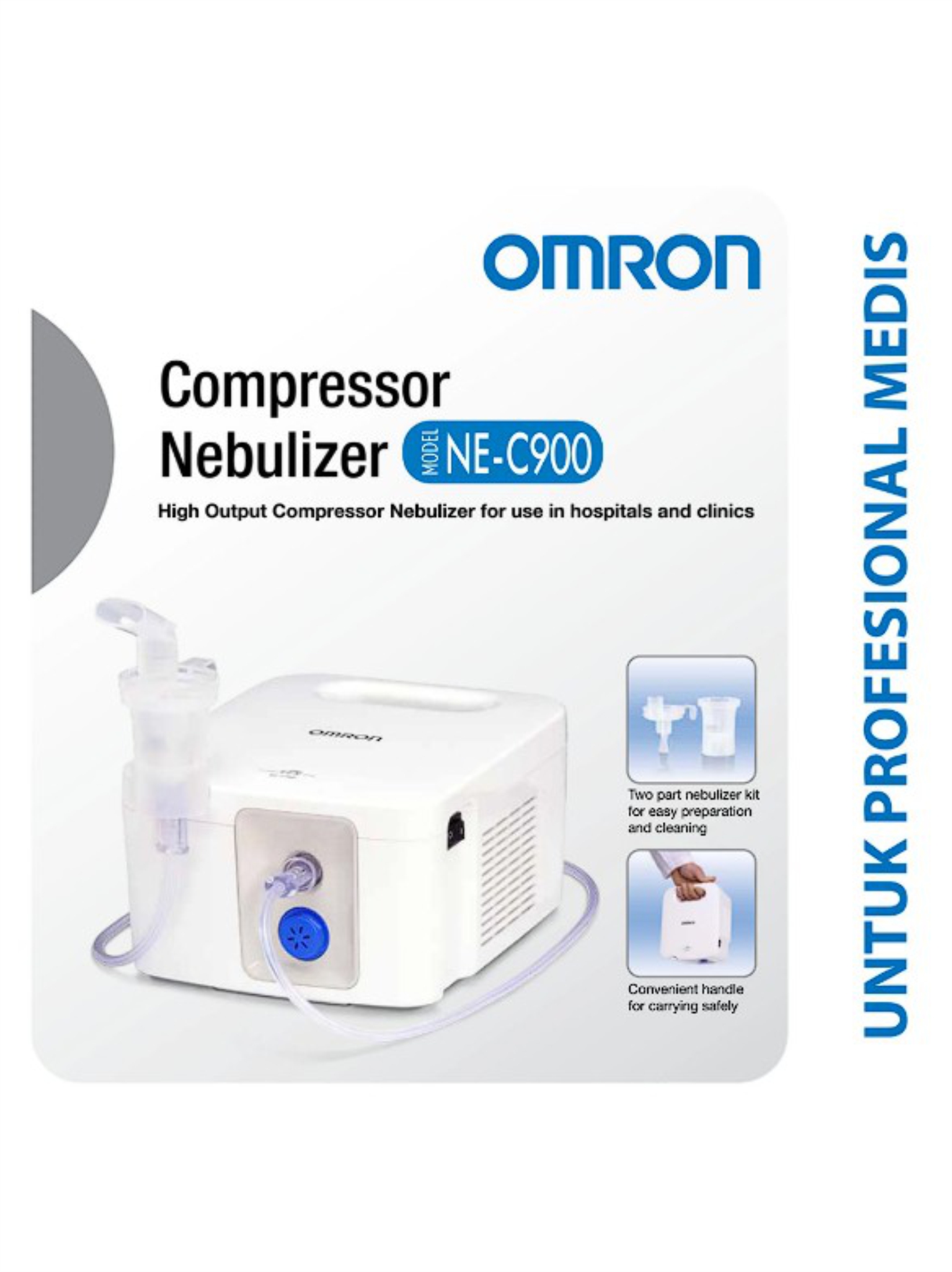 Nebulizer kompresor Omron NE-C900 dirancang untuk digunakan untuk kalangan tenaga medis di rumah sakit atau klinik. Dilengkapi dengan pegangan (grip handle) sehingga memudahkan tenaga kesehatan untuk membawa, selain itu perangkat ini juga mudah digunakan dan dibersihkan (easy prepation & cleaning).