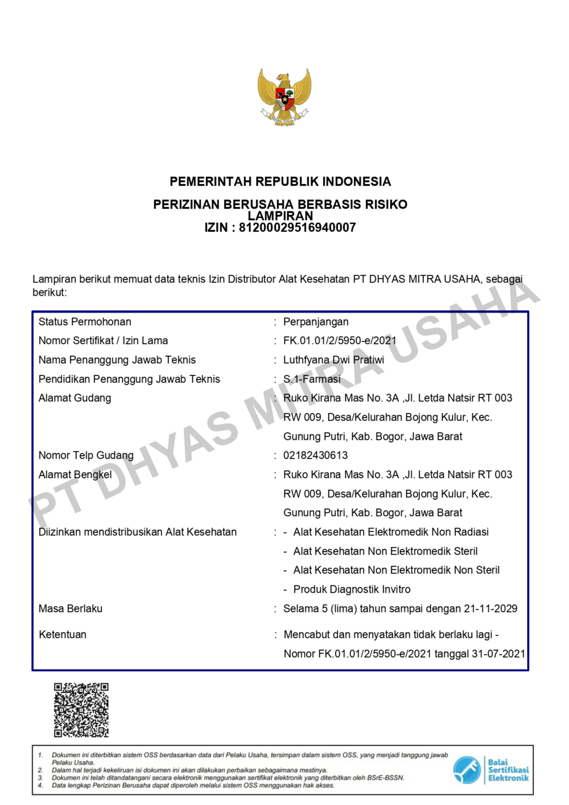 PT Dhyas Mitra Usaha secara resmi telah memperoleh Sertifikat Izin Distributor Alat Kesehatan (IDAK) sebagai distributor alat kesehatan yang terdaftar dan terpercaya. Dengan adanya sertifikat ini, kami berkomitmen untuk mendistribusikan produk-produk alat kesehatan yang berkualitas, aman, dan sesuai dengan regulasi yang berlaku di Indonesia.